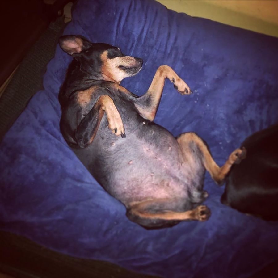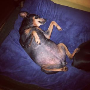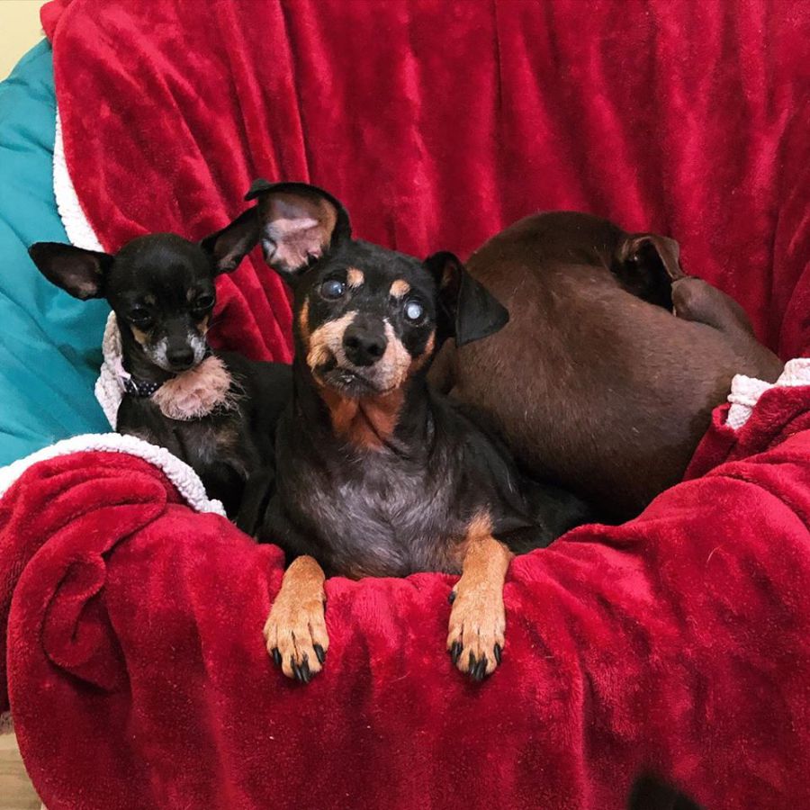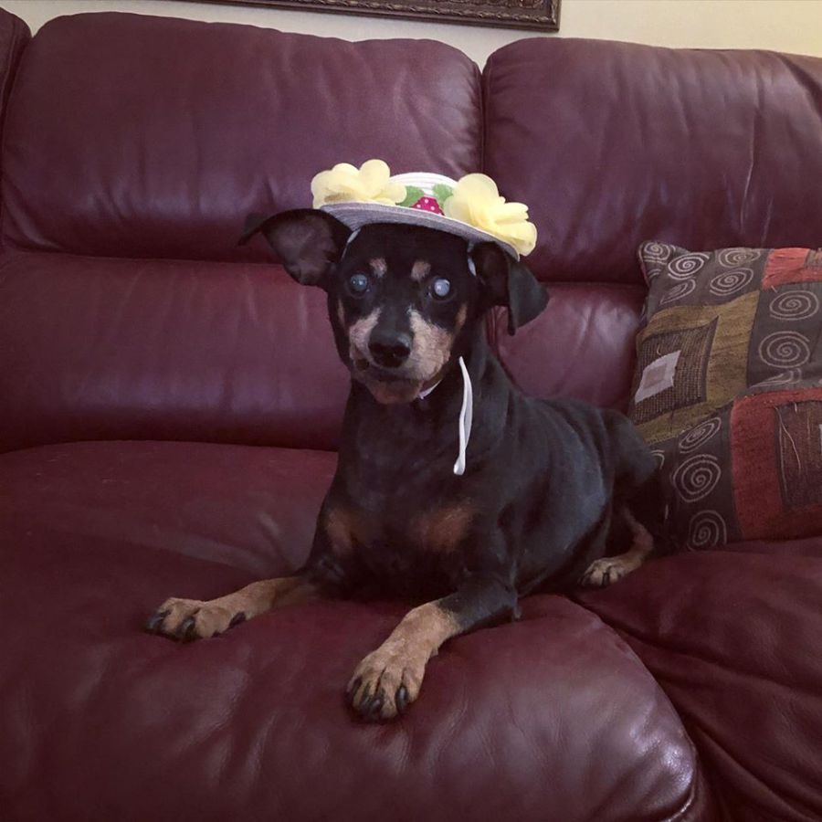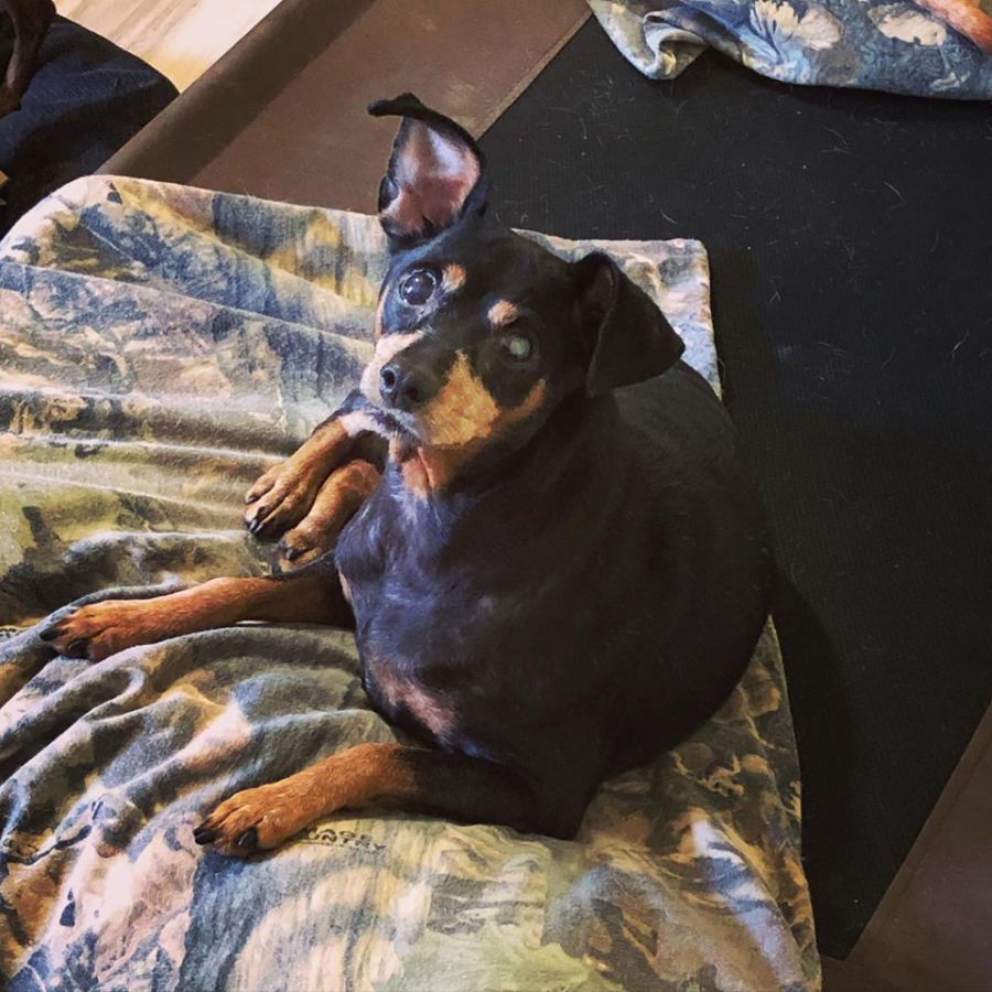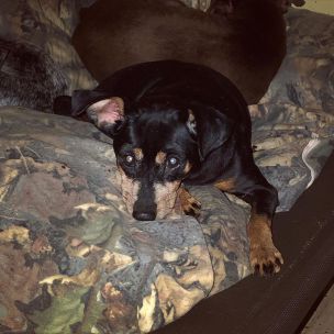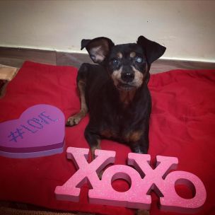 This sweet little girl is our Patty Duke. She's a sweet 10 year old MinPin girl who was rescued from our local animal control in pretty bad shape. She seemed to have q bit of a ruff life before joining us but that has not affected her sweet and loving demeanor. She just adores everyone she meets. She has been fully vetted and does have a couple health issues. She is vision imapired due to cataracts and she had ehrlichia (which is a tick borne disease) she has been treated but it does lie dormant and symptoms can reoccur if her immune system is stressed. She would do great in any home with her super loving personality. If you would like to make this sweet senior lady part of your family, please email us at nuggetvillebrigade@gmail.com. You can also follow Patty Duke on acebook, her folder link can be found here